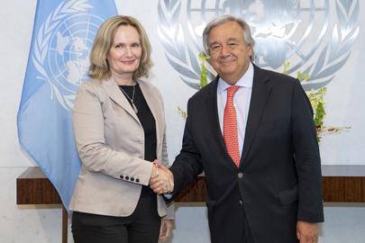 Secretary-General António Guterres (right) meets with Diane Corner, Team Leader for the recently completed Independent Review of the United Nations Mission for the Referendum in Western Sahara (MINURSO). 13 August 2018 United…