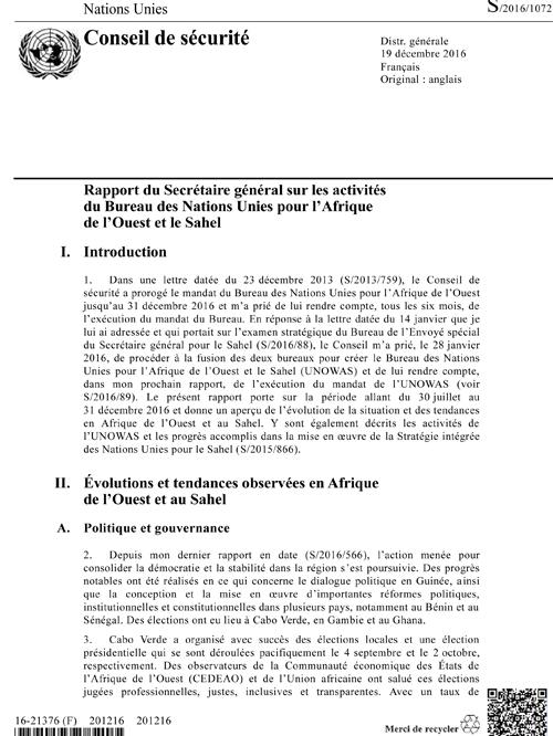 Rapport du Secrétaire général sur les activités de UNOWAS (S/2016/1072)